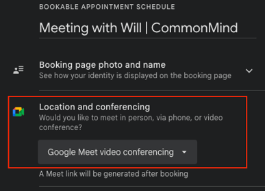 Click Next, a second tab will open up, here you just need to set the Location and Conferencing option to "Google meet conferencing"
