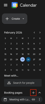 To create a link for booking a meeting with you, go to your Google Calendar, on the left column you'll see Booking pages and a plus icon, click on the icon, a new tab will open up