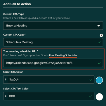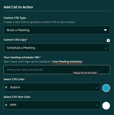 For this we'll start selecting the type of CTA as "Book a Meeting", the Custom CTA copy should be: "Schedule a Meeting", the CTA color should be #1ba0c4 and text color default #ffffff.