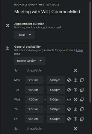On this new tab, make your title "Meeting with {Your Name} | CommonMind", set the General Availability to start after the Daily Standup time, and to finish 1 hour before your leaving time.